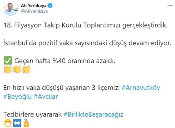 İstanbul Valisi Ali Yerlikaya açıklamasında, ’18. Filyasyon Takip Kurulu Toplantımızı gerçekleştirdik. İstanbul’da pozitif vaka sayısındaki düşüş devam ediyor. Beyaz koyu onay işareti Geçen hafta %40 oranında azaldı. En hızlı vaka düşüşü yaşanan 3 ilçemiz: Arnavutköy, Beyoğlu, Avcılar… Tedbirlere uyararak Birlikte Başaracağız’ dedi.