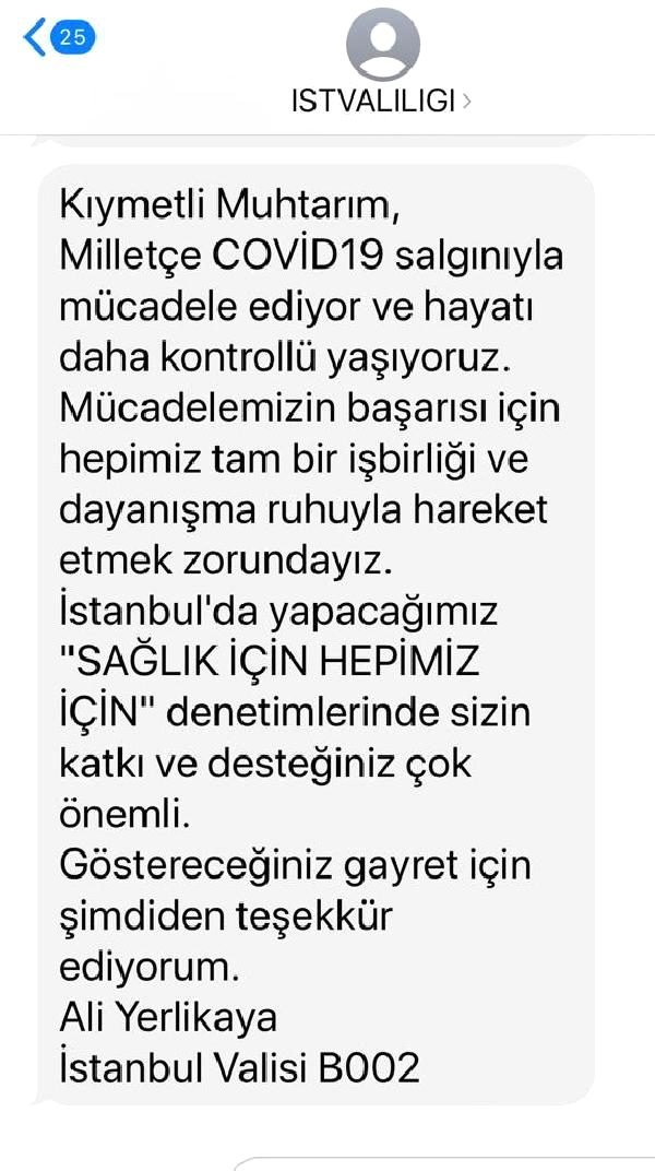 962 Mahalle Muhtarına hitaben Vali Yerlikaya SMS Mesajında; “Kıymetli Muhtarım, Milletçe Kovid-19 salgınıyla mücadele ediyor ve hayatı daha kontrollü yaşıyoruz. Mücadelemizin başarısı için hepimiz tam bir işbirliği ve dayanışma ruhuyla hareket etmek zorundayız. İstanbul’da yapacağımız ‘Sağlık İçin Hepimiz İçin’ denetimlerinde sizin katkı ve desteğiniz çok önemli. Göstereceğiniz gayret için şimdiden teşekkür ediyorum.” ifadelerini kullandı.