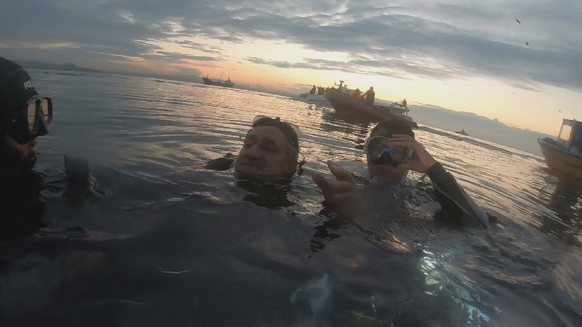 Dalgıçlar yanlarında getirdikleri oksijen tüpünü verdikleri balıkçıyla birlikte su üstüne çıktı. Balıkçının bulunuşu ve kurtarılma anları dalgıçların kamerasına yansıdı.