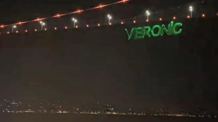 Partiye katılanlar boğazdan geçerken köprünün altına bir tekneden genç kadının ismi lazer ile yazıldı.