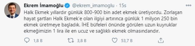 İmamoğlu, Twitter’dan yaptığı açıklamada “Halk Ekmek yıllardır günlük 800-900 bin adet ekmek üretiyordu. Zorlaşan hayat şartları Halk Ekmek’e olan ilgiyi artırınca günlük 1 milyon 250 bin ekmek üretmeye başladık. İHE büfeleri önünde görülen uzun kuyruklar ekmeğimizin 1 lira ile en ucuz ve sağlıklı ekmek olmasındandır” ifadelerini kullandı.