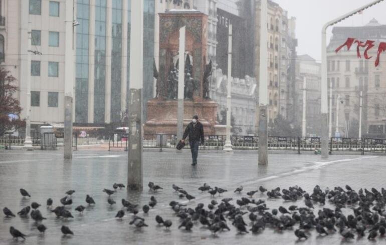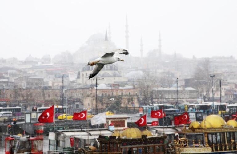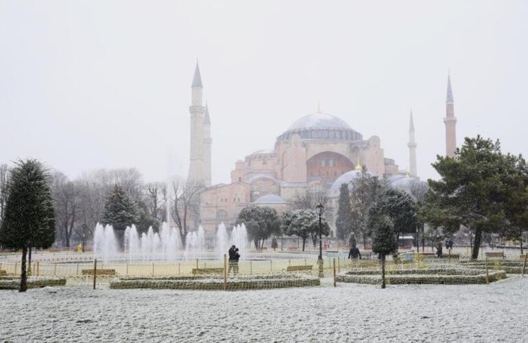 Eminönü’ndeki Yeni Cami, Sultanahmet Meydanı ve Ayasofya-i Kebir Cami-i Şerifi çevresinde de de kar yağışı etkili oldu.