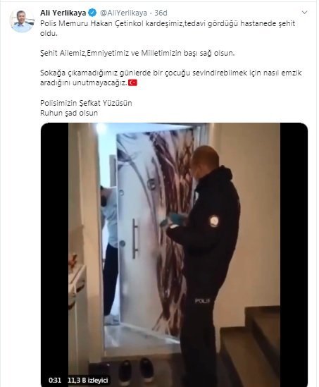 Vali Yerlikaya şu ifadeleri paylaştı; “Polis Memuru Hakan Çetinkol kardeşimiz,tedavi gördüğü hastanede şehit oldu. Şehit Ailemiz,Emniyetimiz ve Milletimizin başı sağ olsun. Sokağa çıkamadığımız günlerde bir çocuğu sevindirebilmek için nasıl emzik aradığını unutmayacağız. Polisimizin Şefkat Yüzüsün. Ruhun şad olsun