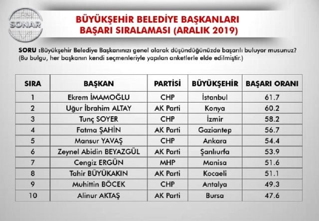 İşte SONAR’ın anketine göre en başarılı belediye başkanları