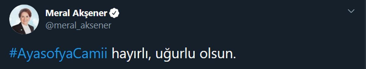 Sosyal medya üzerinden açıklama yapan İYİ Parti Genel Başkanı Meral Akşener, tartışma yaratan karar sonrası “Hayırlı uğurlu olsun” ifadelerini kullandı.