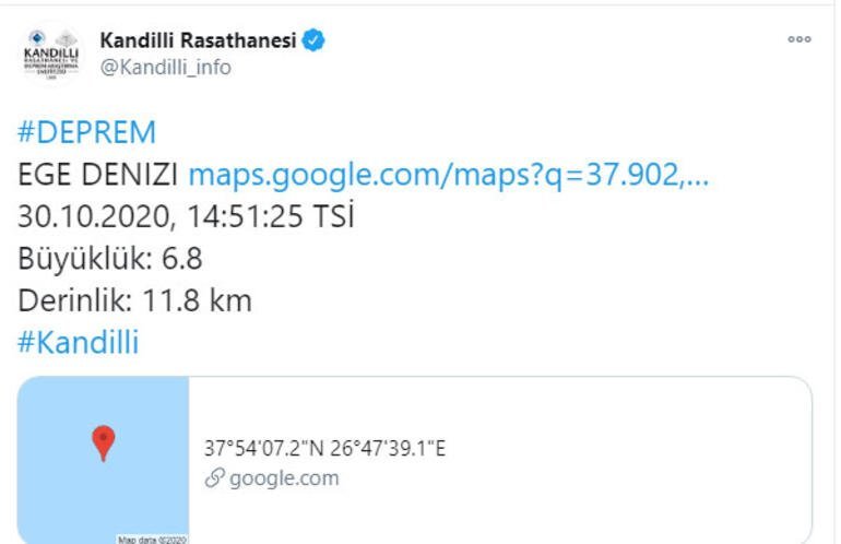 Ege Denizi’nde meydana gelen deprem 11.8 km derinlikte oluştu. Depremin büyüklüğü 6.8 olarak ölçüldü. Bu depremin ardından Kuşadası Körfezi’nde de 4.1 şiddetinde 8.1 km derinliğinde artçı deprem gerçekleşti.