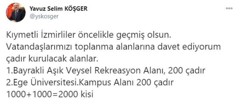 “Vatandaşlarımızı toplanma alanlarına davet ediyorum, çadır kurulacak alanlar, Bayraklı Aşık Veysel Rekreasyon Alanı, 200 çadır, Ege Üniversitesi Kampüsu 200 çadır 1000 1000=2000 kişi.”