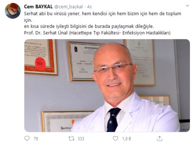 Enfekte olan ismin Hacettepe Üniversitesi’nden Prof. Dr. Ünal olduğu öğrenildi. Ünal’ın durumunun iyi olduğu, tedavisinin sürdüğü bildirildi. Ünal’ın enfekte olduğunu, meslektaşı Cem Baykal, twitter’dan, “Serhat abi bu virüsü yener. Hem kendi için, hem bizim için, hem toplum için. En kısa sürede iyileştiği bilgisini de burada paylaşmak dileğiyle” mesajıyla duyurdu.