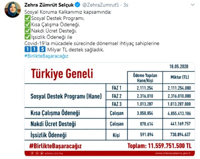 Selçuk, Twitter hesabından, Sosyal Koruma Kalkanı kapsamında yapılan ödemelere dair bilgileri paylaştı.