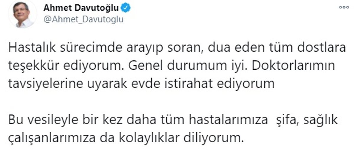 Sosyal medyadan paylaşımda bulunan Davutoğlu, “Hastalık sürecimde arayıp soran, dua eden tüm dostlara teşekkür ediyorum. Genel durumum iyi. Doktorlarımın tavsiyelerine uyarak evde istirahat ediyorum. Bu vesileyle bir kez daha tüm hastalarımıza şifa, sağlık çalışanlarımıza da kolaylıklar diliyorum” dedi.