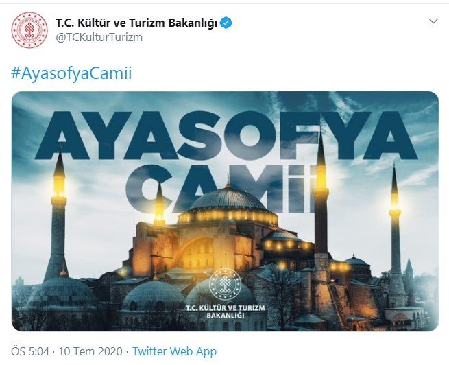 Danıştay’ın kararının ardından Twitter üzerinden paylaşım yapan Kültür ve Turizm Bakanlığı ‘Ayasofya Camii’ ifadelerini kullandı: