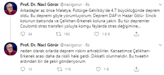 Prof. Dr. Naci Görür paylaşımında, “Arkadaşlar az önce Malatya, Pütürge-Sahilköy’de 4.7 büyüklüğünde deprem oldu. Bu depremi şöyle yorumluyorum: Deprem DAF’ın Hazar Gölü- Sincik kolunun batısında ve Çelikhan-Erkenek koluna yakın.