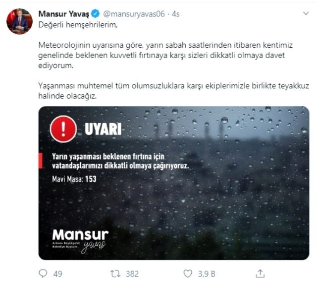 Ankara Büyük Şehir Belediye Başkanı Mansur Yavaş, Twitter hesabından yaptığı paylaşımda, yarın beklenen kuvvetli fırtına nedeniyle Ankaralıları dikkatli olmaları konusunda uyardı.