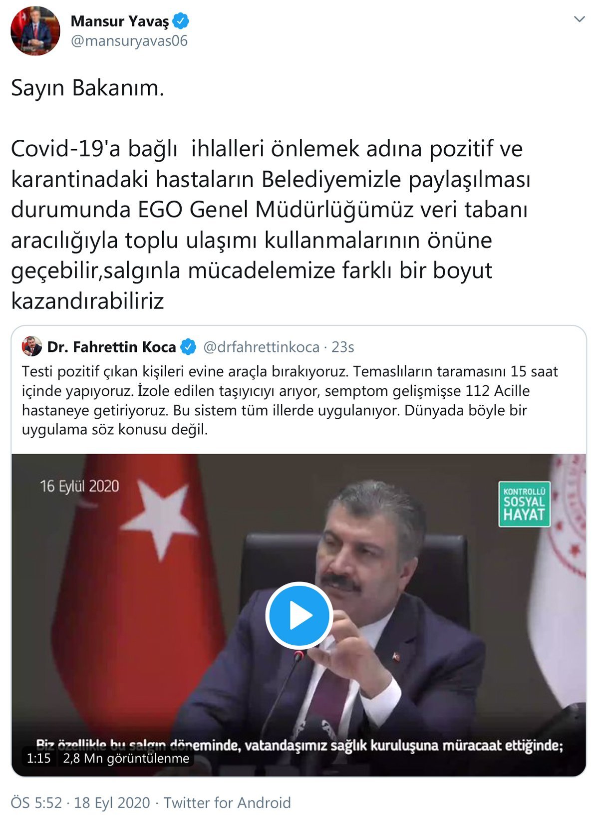 Yavaş, paylaşımında “Sayın Bakanım. Covid-19’a bağlı ihlalleri önlemek adına pozitif ve karantinadaki hastaların Belediyemizle paylaşılması durumunda EGO Genel Müdürlüğümüz veri tabanı aracılığıyla toplu ulaşımı kullanmalarının önüne geçebilir, salgınla mücadelemize farklı bir boyut kazandırabiliriz” ifadelerini kullandı.