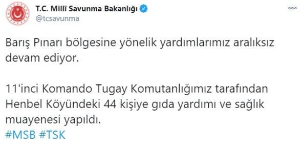 Milli Savunma Bakanlığından yapılan açıklamaya göre, Barış Pınarı bölgesine yönelik yardımlar aralıksız sürüyor.