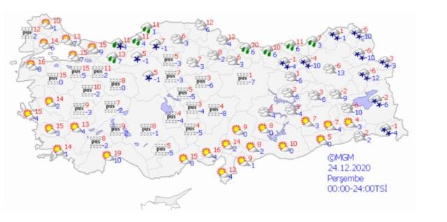 Meteoroloji Genel Müdürlüğü, 24 Aralık Perşembe gününe ait hava durumu raporunu paylaştı. Meteoroloji’nin verilerine göre; Bolu, Düzce, Karabük, Ankara, Ardahan, Artvin, Gümüşhane, Bayburt, Kars, Iğdır , Ağrı, Van ve Hakkari’de yoğun kar yağışı etkili olacak.