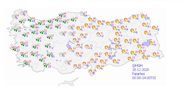 Pazar günü yurdun batısında yağmurlu bir hava hakimken, Doğu’da güneş yüzünü gösterecek. İstanbul’da; hava kapalı en düşük sıcaklık 13, en yüksek sıcaklık ise 16 derece olarak ön görülüyor.