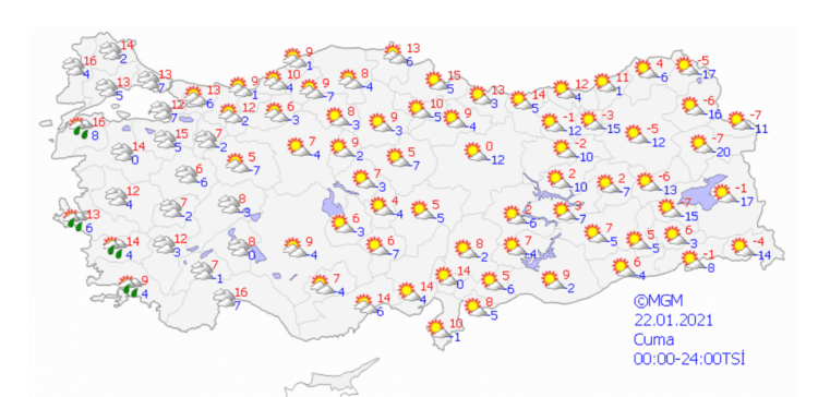 Gece ve sabah saatlerinde kıyılarda hafif, iç ve doğu kesimlerde kuvvetli buzlanma ve don olayı ile birlikte yer yer pus ve sis hadisesi bekleniyor.