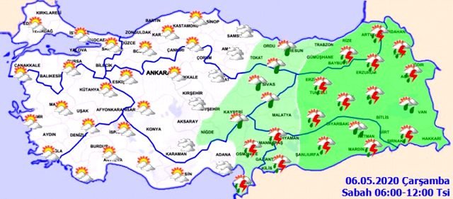 Çarşamba doğu bölgelerde görülecek sağanak ve yer yer gök gürültülü sağanak yağışların; Doğu Anadolu’nun doğusu (Erzurum’un güney ve doğu ilçeleri, Kars, Ardahan, Ağrı, Iğdır, Muş, Bitlis, Van, Hakkari ve Şırnak) ile Diyarbakır, Mardin, Batman, Siirt ve Artvin çevrelerinde yerel olarak kuvvetli olacağı ve metrekareye 20-50 kilogram yağış bırakacağı tahmin ediliyor.