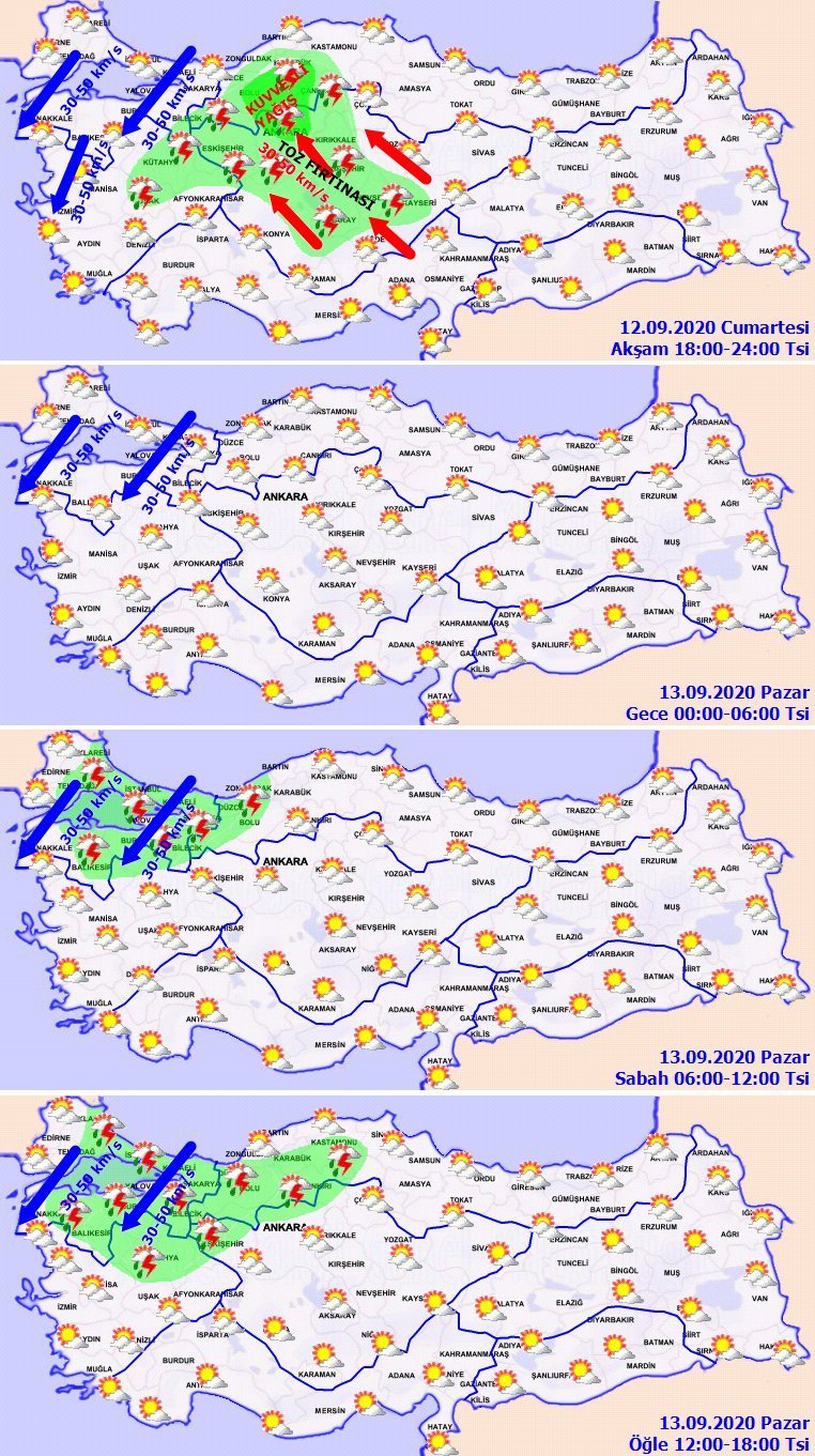 * İç Anadolu: Parçalı bulutlu, bu akşam saatlerinde Ankara, Eskişehir, Çankırı, Kırıkkale, Aksaray, Nevşehir, Kırşehir ve Kayseri, yarın (Pazar) öğle saatlerinden sonra Çankırı ve Eskişehir ile Ankara’nın kuzey ve batı çevrelerinin yerel olmak üzere sağanak ve gök gürültülü sağanak yağışlı geçeceği tahmin ediliyor. Yağışların bu akşam ilk saatlerde Çankırı’nın batısı ile Ankara çevrelerinde yer yer kuvvetli olması bekleniyor. Rüzgarın, bu akşam saatlerinde güney ve güneydoğu yönlerden yer yer kuvvetli (30-50 km/saat) eseceği tahmin ediliyor. Kuvvetli rüzgar nedeniyle bölge genelinde yer yer toz fırtınasının görülmesi bekleniyor.