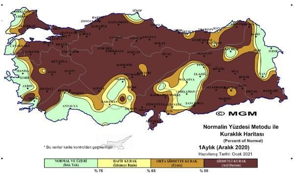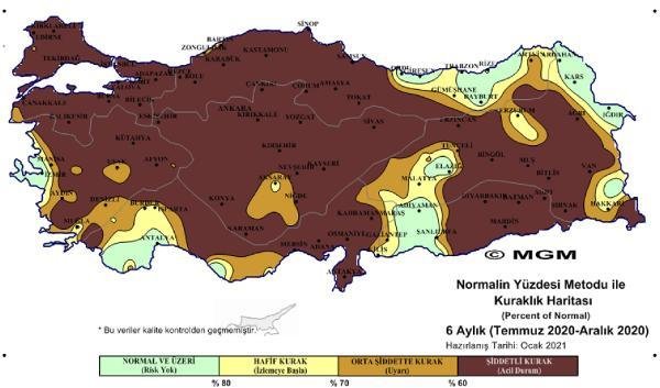 Meteoroloji Genel Müdürlüğü, Standart Yağış İndeksi (SPI – Standardized Precipitation Index) ve Normalin Yüzdesi (PNI – Percent of Normal Index) metotlarına göre, aralık ayı haritası ile birlikte 2020 yılının 12 aylık, 3, 6 ve 9 aylık meteorolojik kuraklık analiz haritalarını yayınladı. Kuraklık haritalarına göre, Türkiye’nin özellikle yılın ikinci yarısında beklenen yağışları alamadığı görüldü. En son yayınlanan aralık ayı haritasında, Türkiye’nin önemli bir bölümü olağanüstü ve şiddetli kurak olarak gösterildi.