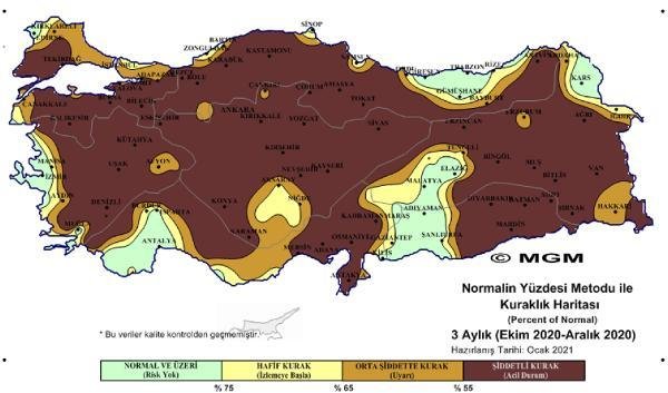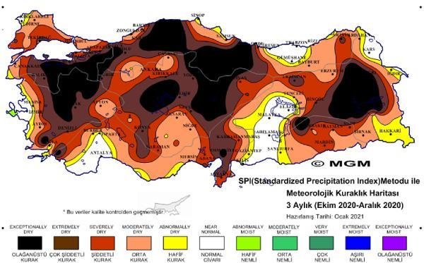 SPI metoduna göre son 3 aylık haritada Güney Marmara ve İç Ege, Batı Karadeniz, İç Anadolu, Doğu Anadolu bölgelerinin önemli bir bölümü ‘olağanüstü kurak’, ‘çok şiddetli kurak’ ve ‘şiddetli kurak’ olarak gösteriliyor. PNI metoduna göre olan haritada aralık ayında Kırklareli, İzmir, Antalya, Adıyaman ve çevresi, Van, Iğdır ve Sinop’un belirli bölgeleri haricindeki yüzde 80’in üzerindeki tüm bölgelerde ‘şiddetli kurak’ ibaresi yer alıyor.