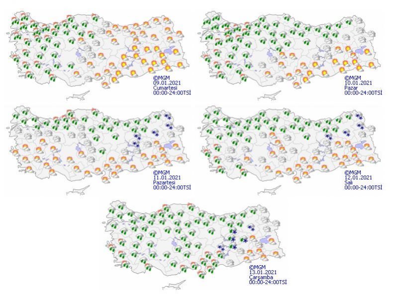 Meteoroloji Genel Müdürlüğü tarafından yapılan son değerlendirmelere göre: Ülkemizin kuzey, iç ve batı kesimlerinin parçalı, yer yer çok bulutlu, Marmara, Ege, Batı Akdeniz, Batı Karadeniz ile İç Anadolu’nun kuzeybatısının yağmur ve sağanak yağışlı geçeceği tahmin ediliyor. Yağışların; Trakya Kesimi, İstanbul, Kocaeli, Yalova ve Çanakkale çevreleri ile Balıkesir’in kuzey ve batı ilçelerinde yer yer kuvvetli (21-50 kg/m2) olması beleniyor. Sabah saatlerinde doğu kesimlerde buzlanma ve don olayı ile birlikte, iç ve doğu kesimlerde yer yer pus ve sis bekleniyor.