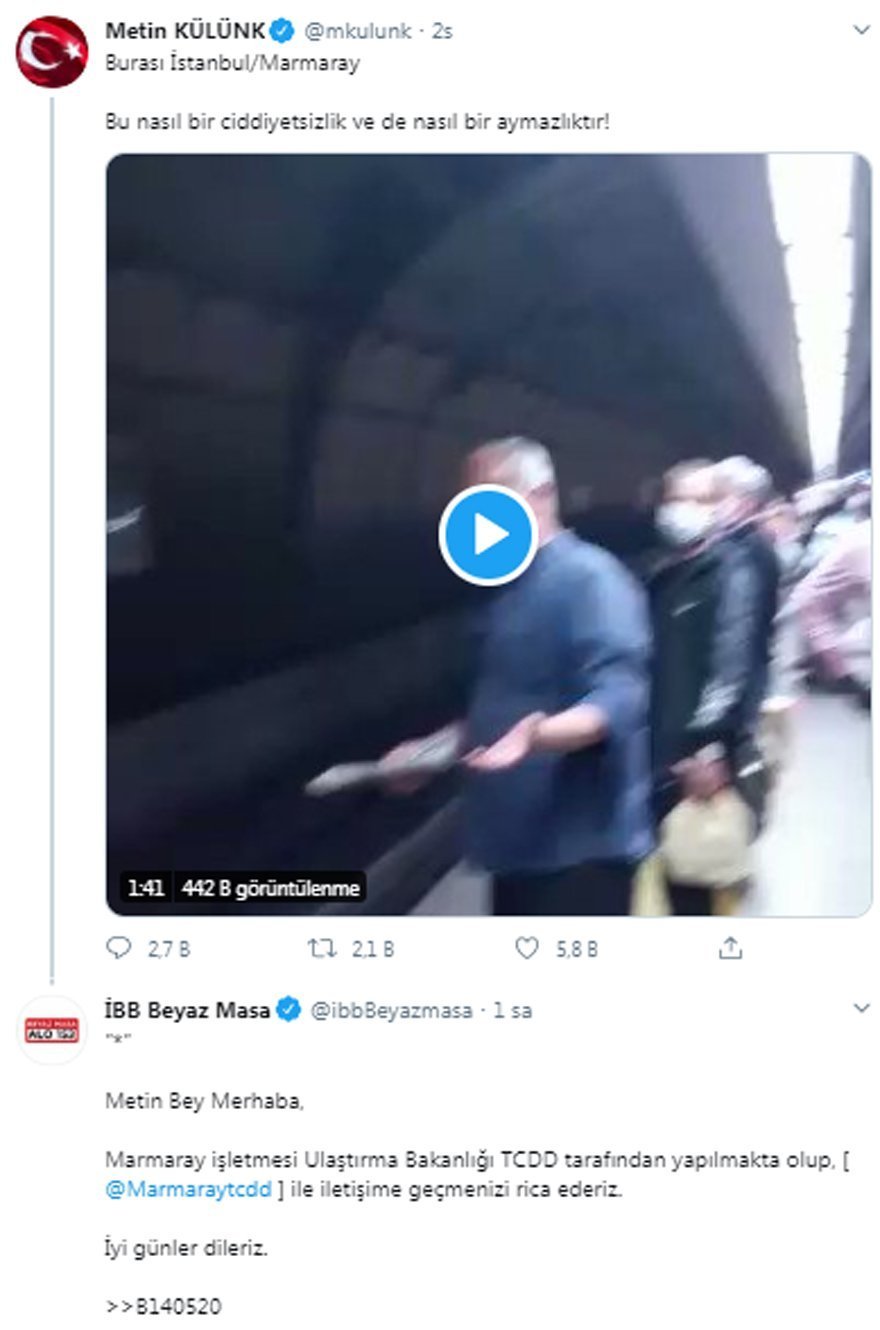 Külünk, videoyu paylaşırken “Burası İstanbul/Marmaray. Bu nasıl bir ciddiyetsizlik ve de nasıl bir aymazlıktır” ifadelerini kullandı.