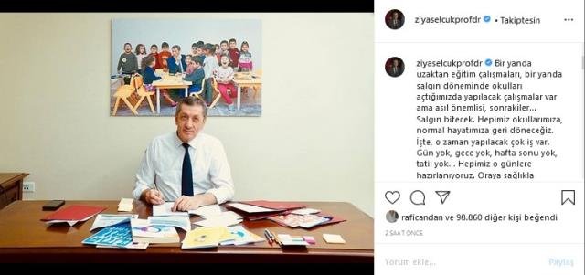 Milyonlarca öğrencinin yüz yüze eğitimle ilgili meraklı bekleyişi sürerken Milli Eğitim Bakanı (MEB) Ziya Selçuk‘tan dikkat çeken bir mesaj geldi. Sosyal medya sitesi Instagram üzerinden bir fotoğraf paylaşan Bakan Selçuk, bakanlık binasında projeler üzerine çalıştığını ifade etti.