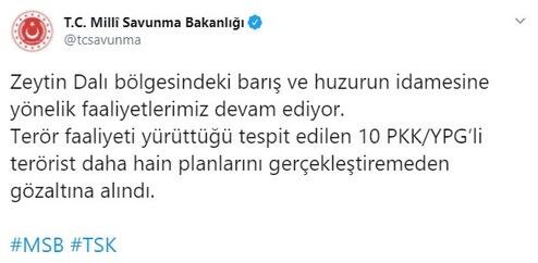 Zeytin Dalı bölgesindeki barış ve huzurun idamesine yönelik faaliyetlerimiz devam ediyor. Terör faaliyeti yürüttüğü tespit edilen 10 PKK/YPG’li terörist daha hain planlarını gerçekleştiremeden gözaltına alındı.