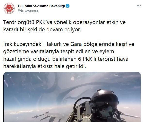 * Irak’ın kuzeyindeki Hakurk ve Gara bölgelerinde keşif ve gözetleme vasıtalarıyla tespit edilen ve eylem hazırlığında olduğu belirlenen 6 PKK’lı terörist hava harekatlarıyla etkisiz hale getirildi.