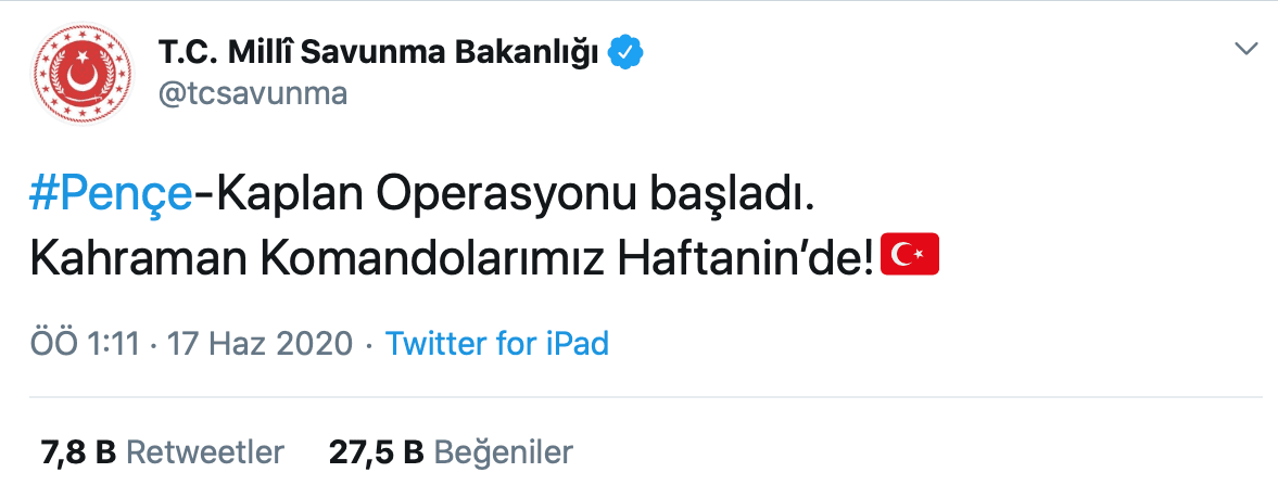 Bakanlıktan Salı günü yapılan açıklamada, Irak kuzeyindeki Haftanin bölgesinde TSK ve Milli İstihbarat Teşkilatı’nın koordine ettiği hava harekâtında, 4 PKK’lının öldürüldüğü duyurulmuştu.