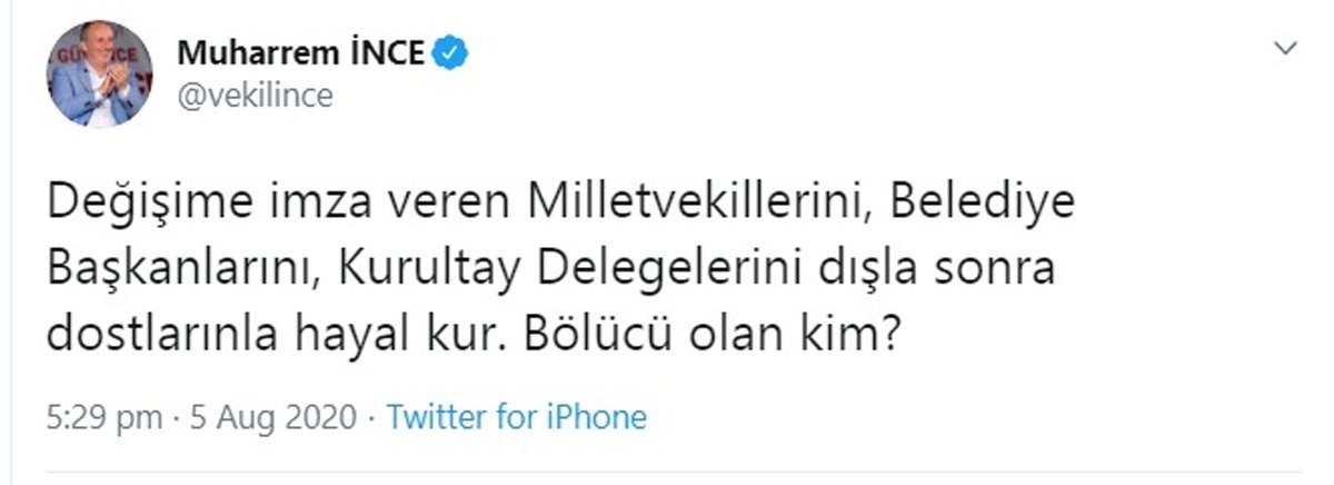 Sosyal medya hesabından açıklamalarda bulunan İnce, “Değişime imza veren Milletvekillerini, Belediye Başkanlarını, Kurultay Delegelerini dışla sonra dostlarınla hayal kur. Bölücü olan kim?” ifadelerini kullandı.