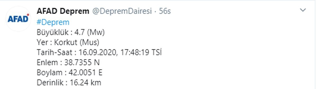 AFAD’dan edinilen bilgiye göre saat 17.48’de Muş Korkut’ta 4,7 büyüklüğünde deprem meydana geldi. Yerin 16.24 km derinliğinde meydana gelen depremde can ve mal kaybıyla ilgili henüz bir açıklama yapılmadı.
