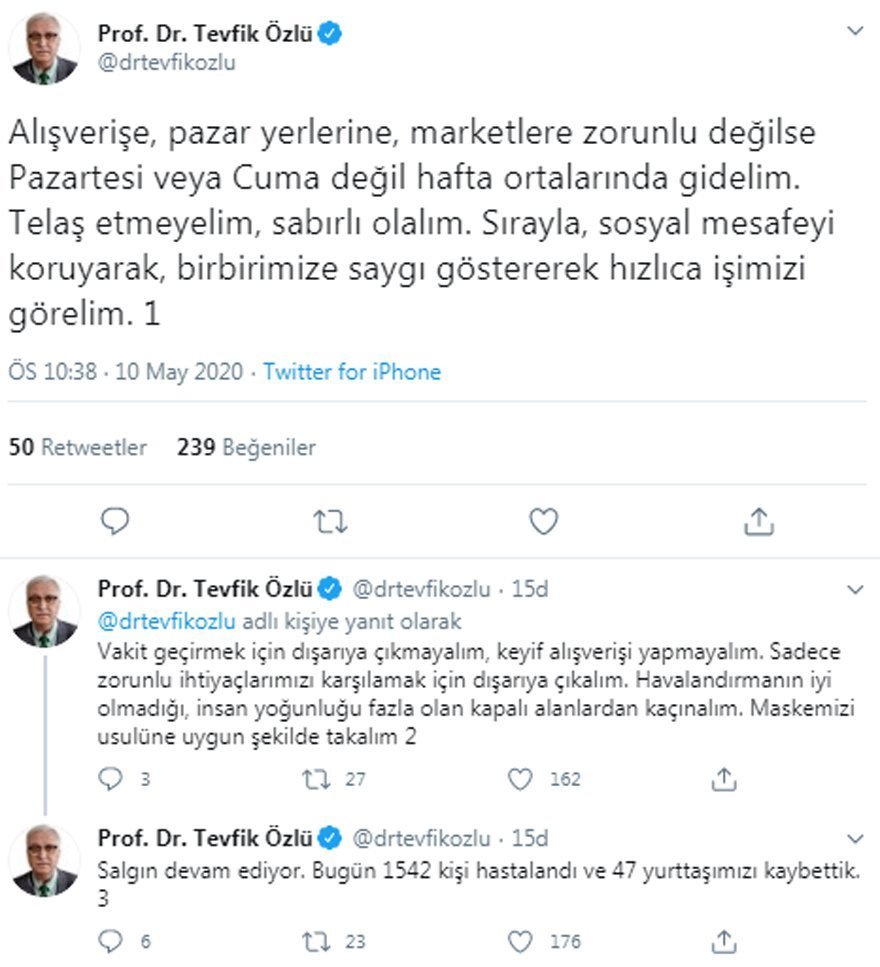 Sağlık Bakanlığı Koronavirüs (corona virüsü) Bilim Kurulu Üyesi ve Göğüs Hastalıkları Uzmanı Prof. Dr. Tevfik Özlü de Twitter hesabından corona virüsü salgınına karşı vatandaşları uyardı.