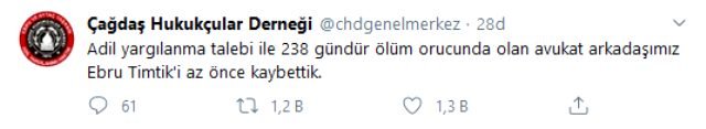 Çağdaş Hukukçular Derneği’nden yapılan açıklamada, “Adil yargılanma talebi ile 238 gündür ölüm orucunda olan avukat arkadaşımız Ebru Timtik’i az önce kaybettik.” denildi.