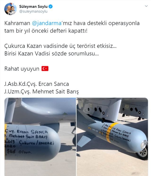 Bakan Soylu, etkisiz hale getirilen teröristler tarafından geçen yıl düzenlenen saldırıda şehit olan Jandarma Astsubay Kıdemli Çavuş Ercan Sanca ve Jandarma Uzman Çavuş Mehmet Sait Barış’ın isimlerini de anarak, “Rahat uyuyun” mesajını paylaştı.