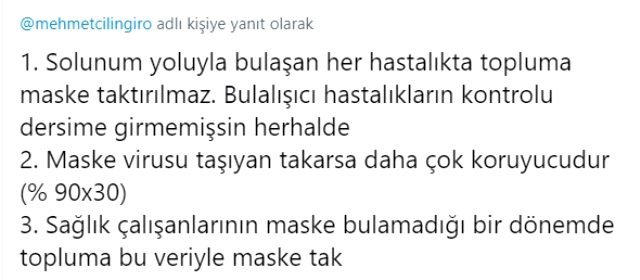 Çilingiroğlu, Ceylan’ın daha önceden katıldığı bir televizyon programından bir kesiti alıntıladı ve Twitter’dan “Mehmet hocam önceden maske takılmasın diyenlerdendiniz? Şimdi takın diyorsunuz? Bilim mi değişti, siz mi anlayamadım? Yani bulaşıcı üst solunum yolu enfeksiyonlarında en basitinden maske takmıyorsunuz öyle mi? Bu ne biçim enfeksiyon kontrolüdür? Hocam?” paylaşımını yaptı.