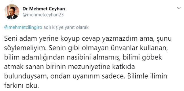 Ceyhan ayrıca Çilingiroğlu için “Seni adam yerine koyup cevap yazmazdım ama, şunu söylemeliyim. Senin gibi olmayan ünvanlar kullanan, bilim adamlığından nasibini almamış, bilimi göbek atmak sanan birinin mezuniyetine katkıda bulunduysam, ondan uyanırım sadece. Bilimle ilimin farkını oku” ifadelerini kullandı.