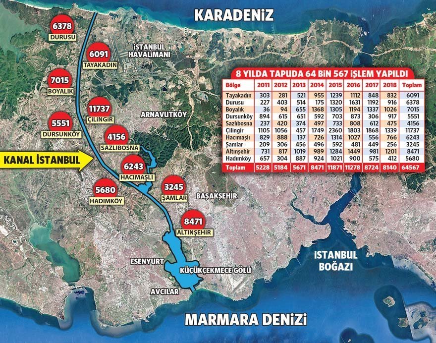 Marmara Denizi’ni Küçükçekmece Gölü’nden ayıran noktadan başlayarak, Sazlıdere Baraj Havzası boyunca devam eden, Sazlıbosna Köyü’nü geçerek Dursunköy’ün doğusuna ulaşıp Baklalı Köyü’nü geçtikten sonra Terkos Gölü’nün doğusunda Karadeniz’e ulaşan Kanal İstanbul güzergahındaki tapu hareketliliğini mercek altına aldık.