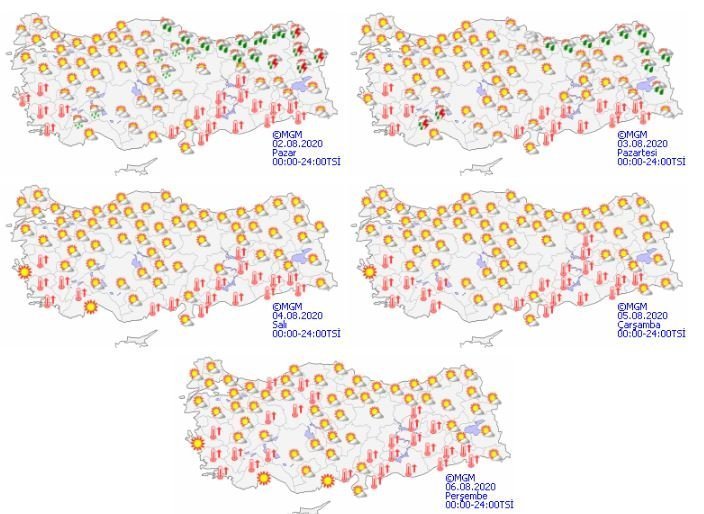 Meteoroloji Genel Müdürlüğü tarafından yapılan son değerlendirmelere göre: Ülkemizin kuzey kesimlerinin parçalı ve yer yer çok bulutlu, Batı Karadeniz, Orta Karadeniz kıyıları, Doğu Karadeniz,Doğu Anadolu’nun kuzeydoğusu ile Edirne, Kırklareli, Tekirdağ’ın iç kesimleri ile Sakarya ve Kocaeli’nin kuzeyinin yerel olmak üzere sağanak ve gök gürültülü sağanak yağışlı, diğer yerlerin az bulutlu ve açık geçeceği tahmin ediliyor.