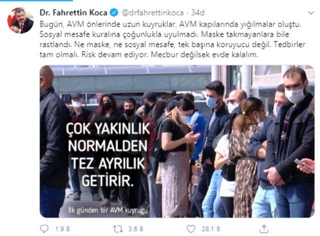 Sağlık Bakanı Fahrettin Koca, kişisel Twitter hesabından yaptığı paylaşımda, AVM’lerde oluşan görüntülere tepki gösterdi. AVM önlerinde uzun kuyruklar ve yığılmalar oluştuğunu belirten Bakan Koca, “Sosyal mesafe kuralına çoğunlukla uyulmadı. Maske takmayanlara bile rastlandı. Ne maske, ne sosyal mesafe, tek başına koruyucu değil. Tedbirler tam olmalı. Risk devam ediyor. Mecbur değilsek evde kalalım” ifadelerini kullandı.