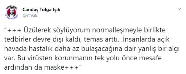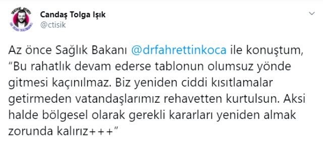 Gazeteci Candaş Tolga Işık’a konuşan Bakan Koca şunları söyledi “Bu rahatlık devam ederse tablonun olumsuz yönde gitmesi kaçınılmaz. Biz yeniden ciddi kısıtlamalar getirmeden vatandaşlarımız rehavetten kurtulsun. Aksi halde bölgesel olarak gerekli kararları yeniden almak zorunda kalırız. Üzülerek söylüyorum normalleşmeyle birlikte tedbirler devre dışı kaldı, temas arttı. İnsanlarda açık havada hastalık daha az bulaşacağına dair yanlış bir algı var. Bu virüsten korunmanın tek yolu önce mesafe ardından da maske.”