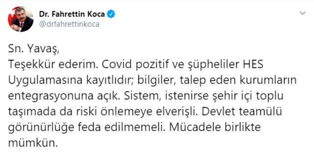 Bakan Koca, Twitter‘dan yaptığı açıklamada, Büyükşehir Belediye Başkanı Yavaş’a teşekkür ederek, “Kovid pozitif ve şüpheliler HES uygulamasına kayıtlıdır, bilgiler, talep eden kurumların entegrasyonuna açık. Sistem, istenirse şehir içi toplu taşımada da riski önlemeye elverişli. Devlet teamülü görünürlüğe feda edilmemeli. Mücadele birlikte mümkün.” ifadelerini kullandı.