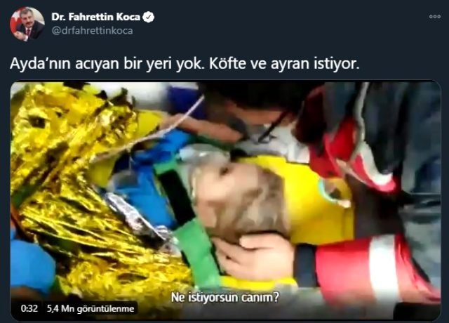 Minik çocuk üzerinden prim yapıldığını iddia eden tepkiler sonrası Bakan Koca Twitter hesabından şu metni paylaştı: “Herhangi bir yerin acıyor mu Ayda? Soruyu soran Acil Tıp Uzmanı bir UMKE gönüllüsüydü. Göçük altından çıkarılıp, ambulansa alınan 3 yaşındaki bir çocuğa hayata dönüş anında soru acaba nasıl sorulmalıydı?”