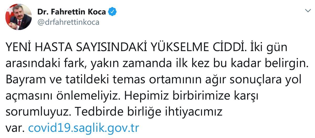 Güncel verileri sosyal medya hesabından paylaşan Sağlık Bakanı Koca, yeni hasta sayısındaki yükselmenin ciddi olduğunu vurguladı.