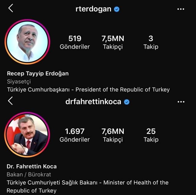 Erdoğan’ın Instagram’da 7.5 milyon takipçisi bulunurken, Fahrettin Koca’nın ise 7.6 milyon takipçiye yükselmesi dikkat çekti.