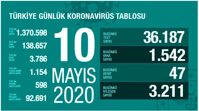Sağlık Bakanı Fahrettin Koca, Türkiye’nin Günlük Koronavirüs Tablosu’nu Twitter hesabından paylaştı. Buna göre, Türkiye’de son 24 saatte 47 kişi vefat etti, bin 542 yeni vaka tespit edildi. Son 24 saatte tedavisi tamamlanan 3 bin 211 hasta ise taburcu oldu.