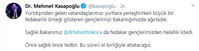 Bakan Kasapoğlu o anlara ilişkin bir videoyu sosyal medya hesabından ” Yurtdışından gelen vatandaşlarımızı yurtlara yerleştirirken büyük bir fedakarlık örneği gösteren gençlerimizi Bakanlığımızda ağırladık.Sağlık Bakanımız @drfahrettinkoca da fedakar gençlerimizden helallik istedi. Önce sağlık önce tedbir. Bu süreci el birliğiyle atlatacağız.” notu ile paylaştı.