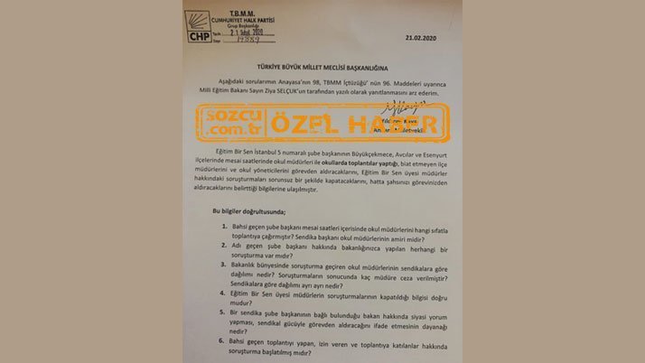 Milletvekili Kaya, 21.02.2020 tarih 19889 sayılı Bakan Selçuk’un cevaplamasını istediği sorgu önergesinde; “Eğitim Bir Sen İstanbul 5 numaralı şube başkanının Büyükçekmece, Avcılar ve Esenyurt ilçelerinde mesai saatlerinde okul müdürleri ile okullarda toplantılar yaptığı, biat etmeyen ilçe müdürlerini ve okul yöneticilerini görevden aldıracaklarını, Eğitim Bir Sen üyesi müdürler hakkındaki soruşturmaları sorunsuz bir şekilde kapatacaklarını, hatta şahsınızı görevinizden aldıracaklarını belirttiği bilgilerine ulaşılmıştır” dedi.